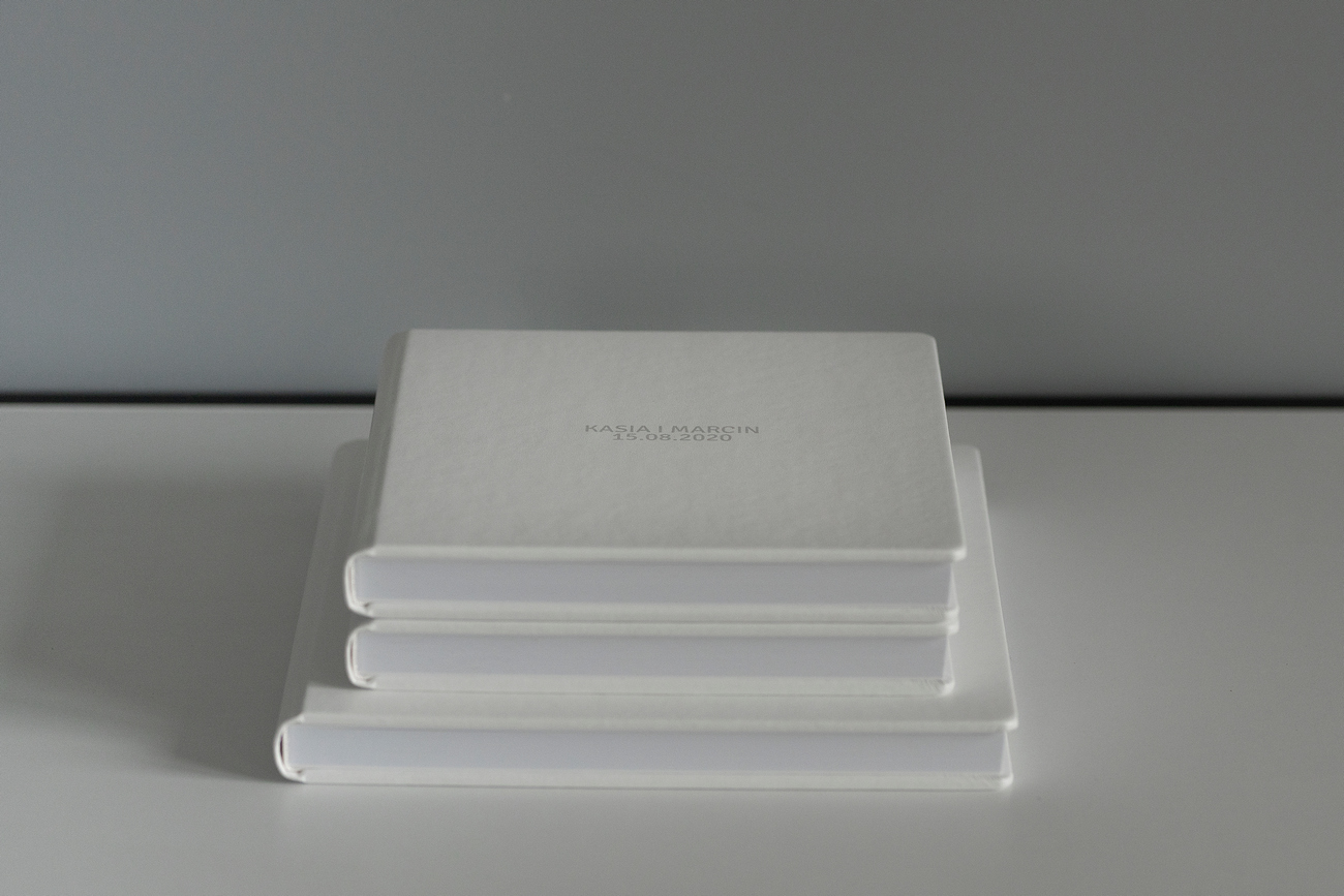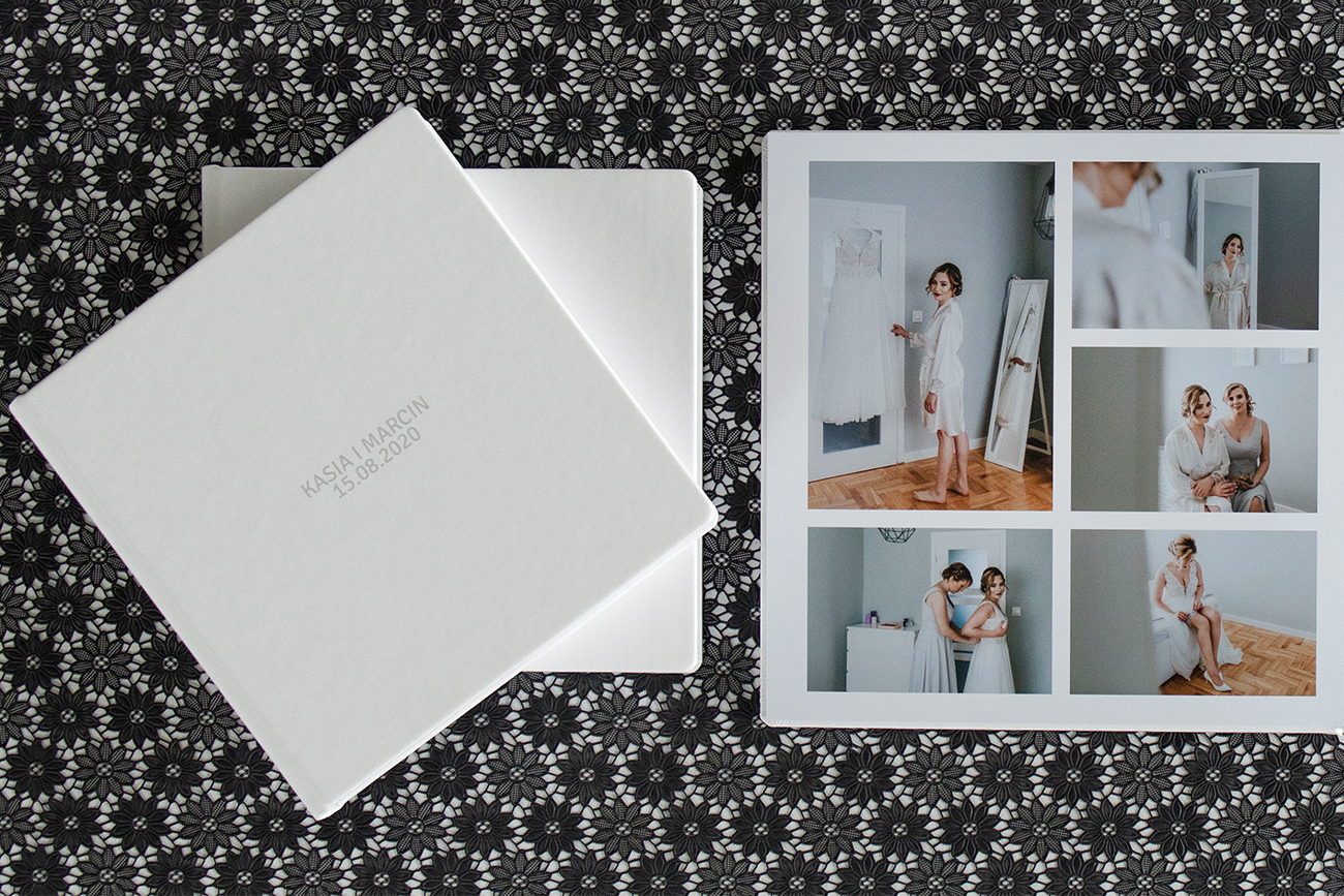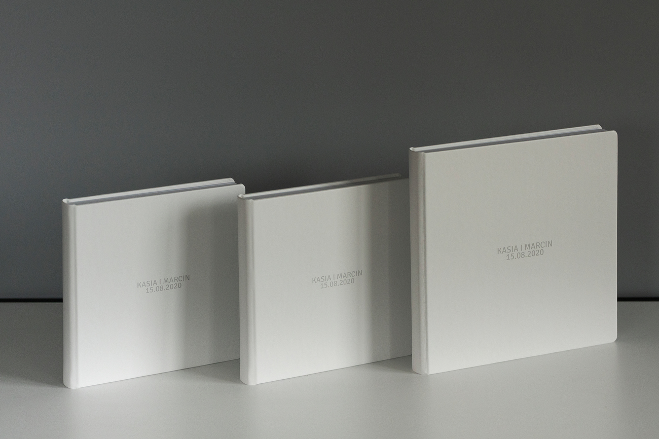 Profesjonalny fotoalbum (30 stron) w rozmiarze 30x30cm + 2 mniejsze bliźniacze albumy. Karty naświetlane na jedwabiu, z delikatnymi kontrastami i świetną reprodukcją barw. Do personalizacji kolor oraz materiał okładki zewnętrznej (tkanina, ekoskóra lub zamsz).